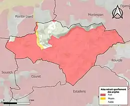 Le retrait-gonflement des sols argileux est susceptible d'engendrer des dommages importants aux bâtiments en cas d’alternance de périodes de sécheresse et de pluie. 83,7 % de la superficie communale est en aléa moyen ou fort (88,8 % au niveau départemental et 48,5 % au niveau national). Sur les 184 bâtiments dénombrés sur la commune en 2019, 178 sont en aléa moyen ou fort, soit 97 %, à comparer aux 98 % au niveau départemental et 54 % au niveau national. Une cartographie de l'exposition du territoire national au retrait gonflement des sols argileux est disponible sur le site du BRGM[27],[Carte 3].