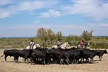 Les manadiers réunissent les taureaux quotidiennement avec l’aide de gardians. La spécificité de la viande de taureau camarguais lui a valu par décret FCEC9600159D du [6] l’obtention de la 1re viande AOC en Europe et en 2001, une AOP[7].