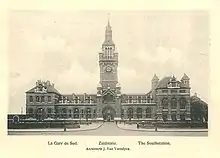 La gare de voyageurs d'Anvers-Sud sur une carte postale de 1911, démolie en automne 1965. | |