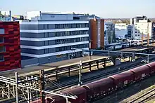 Vue des voies de la gare en 2018 avec, en rouge, l'auberge de jeunesse et, en gris et blanc, le nouveau bâtiment voyageurs. | |