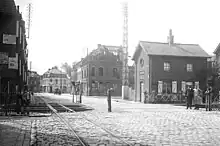 Le premier bâtiment voyageur avec au fond la halle à marchandises.