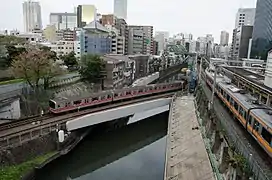 La gare d'Ochanomizu est appréciée des photographes ferroviaires pour le point de vue offert depuis le pont Hijiri : la ligne Marunouchi traverse la rivière Kanda puis s'engouffre sous les voies des lignes Chūō et Chūō-Sōbu, avec les premiers immeubles d'Akihabara en arrière-plan.