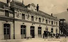 Le second bâtiment voyageurs de la gare de Bellegarde est construit en 1907[22] par la Compagnie des chemins de fer de Paris à Lyon et à la Méditerranée. Ce bâtiment de style chalet est doté d'un corps de logis à deux niveaux de neuf travées, flanqué de plusieurs extensions. Sa façade est surmontée d'une horloge ainsi que de quatorze écussons polychromes représentant les villes de Grenoble, Saint-Claude, Genève, Lyon, Paris, Marseille, Mâcon, Lons-le-Saunier, Chambéry, Thonon, Bonneville, Seyssel, Annecy et Trévoux.