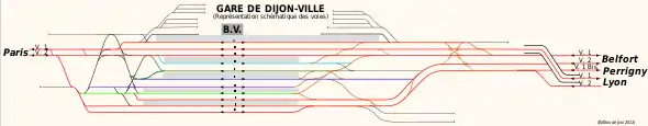 La gare de Dijon-Ville dispose de dix voies banalisées, de la voie A – qui longe le B.V. – à la voie J. Toutes ces voies sont équipées de quais voyageurs, à l'exception de la voie B réservée à la circulation des trains de fret, principalement de sens impair. Certaines de ces voies autorisent, pour les deux sens de circulation, la traversée de la gare à la vitesse maximale de 60 km/h.