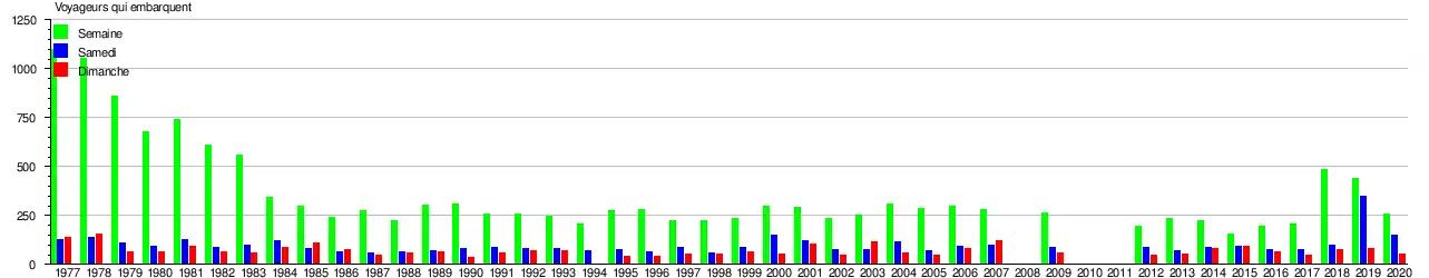 Le graphique et le tableau montrent en moyenne le nombre de passagers qui embarquent durant la semaine, le samedi et le dimanche à la gare de Forest-Est[10].