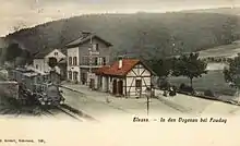 Le bâtiment voyageurs (BV) de la gare d'origine était constitué d'un rez-de-chaussée en maçonnerie surmonté d'un étage en partie recouvert de bois, avec deux travées par face longitudinale avec sur sa droite une halle à marchandises en planches et sur sa droite une extension en bois sculpté de style rustique et plusieurs petites annexes en pans de bois.