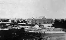 Le premier bâtiment de gare à partir de 1866 était une simple maison provisoire en bois, qui fut ensuite déplacée à Nørresundby. Conçu par l'architecte Johan Daniel Herholdt, le bâtiment permanent de la nouvelle gare fut inauguré en 1869. Il existe toujours à l'adresse Oldenborggade 1 et est aujourd'hui utilisé comme bureaux[5].