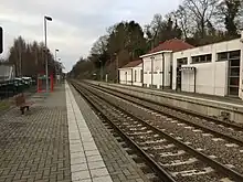 La halte et l'ancien bâtiment voyageurs. Vus depuis le passage à niveau en 2015. | |