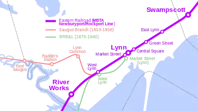 Le Boston, Revere Beach & Lynn desservaient également son propre dépôt Lynn (à un pâté de maisons de la gare Eastern Railroad) à Market Street près de Broad Street, ainsi que sa propre gare West Lynn adjacente à la gare du chemin de fer Eastern juste à l'est de Commercial Street[34]. Aucune des deux stations n'existe encore.