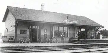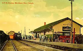 La gare de Markham a été construite par le Toronto & Nipissing Railway en 1869, alors que sa construction progressait vers le nord depuis Scarborough Junction[3]. Il s'agissait d'une structure rectangulaire en bois avec un toit en appentis pour abriter les passagers sur le quai, suivant un modèle similaire à celui des autres gares construites par le Toronto & Nipissing ailleurs à la même époque. Elle contenait une salle d'attente, une salle de bagages et le bureau de l'agent de la gare[4]. Le premier train est arrivé de Toronto le 1er juillet 1871, alors que la construction au nord d'Uxbridge était toujours en cours. Le service au-delà d'Uxbridge a commencé en octobre de la même année[3].