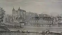 ![]() La première gare de Montbéliard vers 1863 |
