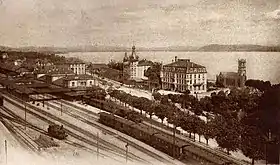 Point de convergence de trois axes ferroviaires en construction, l’emplacement de la gare fait l’objet, dès 1852, d’une âpre concurrence entre les compagnies ferroviaires (Franco Suisse et Jura Industriel) et leurs partisans politiques et économiques respectifs. Il faudra recourir à l’arbitrage du Conseil d’État en 1858 pour que les parties s’entendent sur une gare unique à édifier sur les hauts de la ville plutôt qu’au bord du lac. Modeste et fonctionnel, le premier bâtiment des voyageurs est mis en service au en 1859[6],[7].