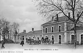 La gare de Parthenay est établie à l'est du centre-ville peu après le viaduc sur le Thouet[1], elle est mise en service le , par l'Administration des chemins de fer de l'État (État), lorsqu'elle ouvre à l'exploitation sa ligne de Niort à Montreuil-Bellay[2].