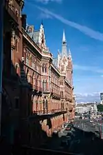 Un concours a été organisé pour la conception des bâtiments et de l'hôtel de la gare en . Onze architectes ont été invités à concourir, soumettant leurs conceptions en août. En , le projet néogothique en brique de George Gilbert Scott a été choisi. Le choix a généré une certaine inquiétude, en partie parce que le projet de Scott, coûtant 315 000 £, était de loin le plus cher. La splendeur de la façade de Scott a impressionné les architectes, leur permettant de surpasser toutes les autres gares de la capitale. Une compression budgétaire a obligé à simplifier plusieurs éléments de la façade, mais le dessin original a en grande partie été respecté.