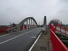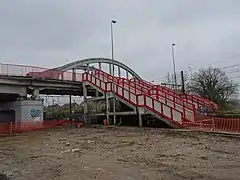 À gauche l'emplacement du bâtiment démoli, et le pont avec les accès aux quais par des escaliers. | |