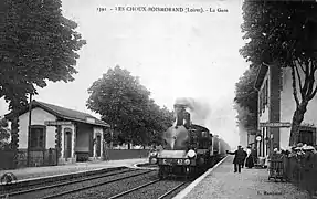 - Sur la photo de la carte postale de l'infobox, on remarque : « l'arrivée d'un omnibus tracté par une locomotive 121 série 111-400. À hauteur du premier étage du B. V. courent les fils aériens de transmission des signaux (bâtiment type P.L.M. à toiture à 2 pans et 3 portes par façade) »[1].