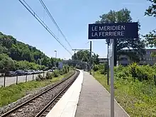 La halte actuelle dessert le lycée Blaise-Pascal, mais à l'origine la halte était située plus au nord sur le territoire de la commune de Charbonnières-les-Bains(45,772846, 4,746887). Elle a été déplacée lors des travaux du tram-train de l'Ouest lyonnais. Un mouvement social a tenté de conserver une halte à l'ancien emplacement, en plus de la nouvelle gare du Méridien, en la renommant La Ferrière, mais sans succès, sauf d'obtenir qu'un cheminement piétonnier soit créé entre les deux emplacements et sauf de constater que la gare du Méridien porte curieusement le nom « Le Méridien La Ferrière » sur le panneau en station.