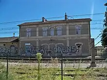 Derrière la gare, un faisceau de voies de service inutilisées dessert en impasse l'ancienne halle à marchandises.