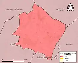 Le retrait-gonflement des sols argileux est susceptible d'engendrer des dommages importants aux bâtiments en cas d’alternance de périodes de sécheresse et de pluie. La totalité de la commune est en aléa moyen ou fort (88,8 % au niveau départemental et 48,5 % au niveau national). Sur les 268 bâtiments dénombrés sur la commune en 2019, 268 sont en aléa moyen ou fort, soit 100 %, à comparer aux 98 % au niveau départemental et 54 % au niveau national. Une cartographie de l'exposition du territoire national au retrait gonflement des sols argileux est disponible sur le site du BRGM[24],[Carte 3].