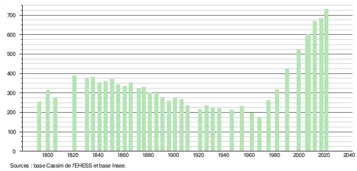 L'évolution du nombre d'habitants est connue à travers les recensements de la population effectués dans la commune depuis 1793. Pour les communes de moins de 10 000 habitants, une enquête de recensement portant sur toute la population est réalisée tous les cinq ans, les populations légales des années intermédiaires étant quant à elles estimées par interpolation ou extrapolation[28]. Pour la commune, le premier recensement exhaustif entrant dans le cadre du nouveau dispositif a été réalisé en 2007[29].