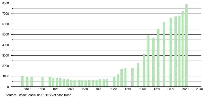 L'évolution du nombre d'habitants est connue à travers les recensements de la population effectués dans la commune depuis 1793. Pour les communes de moins de 10 000 habitants, une enquête de recensement portant sur toute la population est réalisée tous les cinq ans, les populations légales des années intermédiaires étant quant à elles estimées par interpolation ou extrapolation[32]. Pour la commune, le premier recensement exhaustif entrant dans le cadre du nouveau dispositif a été réalisé en 2006[33].