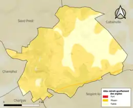 La commune est vulnérable au risque de mouvements de terrains constitué principalement du retrait-gonflement des sols argileux[16]. Cet aléa est susceptible d'engendrer des dommages importants aux bâtiments en cas d’alternance de périodes de sécheresse et de pluie. 73,6 % de la superficie communale est en aléa moyen ou fort (52,8 % au niveau départemental et 48,5 % au niveau national). Sur les 540 bâtiments dénombrés sur la commune en 2019, 423 sont en aléa moyen ou fort, soit 78 %, à comparer aux 70 % au niveau départemental et 54 % au niveau national. Une cartographie de l'exposition du territoire national au retrait gonflement des sols argileux est disponible sur le site du BRGM[17],[Carte 2].