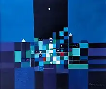 Il compose ses œuvres en utilisant l'espace pictural libre et la figuration. Il insère de manière importante la géométrie dans son œuvre.