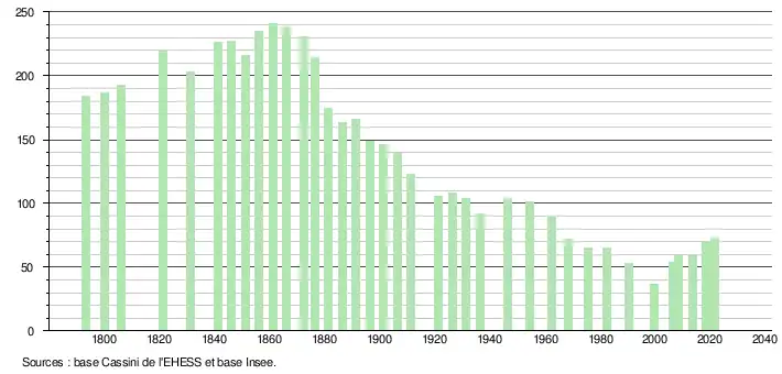 L'évolution du nombre d'habitants est connue à travers les recensements de la population effectués dans la commune depuis 1793. Pour les communes de moins de 10 000 habitants, une enquête de recensement portant sur toute la population est réalisée tous les cinq ans, les populations légales des années intermédiaires étant quant à elles estimées par interpolation ou extrapolation[26]. Pour la commune, le premier recensement exhaustif entrant dans le cadre du nouveau dispositif a été réalisé en 2008[27].