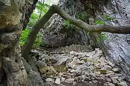 L'occupation de la caverne débute à la fin du Paléolithique moyen. L'abri sous roche est ensuite utilisé de la période aurignacienne jusqu'au Mésolithique, puis durant l'âge du fer et enfin le Moyen Âge[12],[13]. L'existence de la grotte est connue depuis la seconde moitié des années 1950, puis fouillée au début des années 1970. L'un des artefacts mis au jour au sein de la cavité préhistorique est une sculpture votive, un adorant, façonnée en demi-relief représentant une créature mi-humaine mi-animale. L'objet, fabriqué à partir d'ivoire de défense de mammouth, mesure 3,4 cm de haut pour 1,4 de large. Cette pièce d'art préhistorique est datée d'environ 30 000 ans av. J.-C.[3].