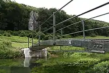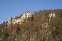 La Geißenklösterle est située dans le massif de Bruckfels, une formation rocheuse faisant partie du Jura souabe moyen[17],[18],[19],[20]. La semi-grotte s'élève à une altitude de 580 m[2] et elle est établie à une hauteur de 60 m au-dessus du talweg de la vallée de l'Ach (de)[1],[6],[21],[13], affluent de la Blau[22],[23].