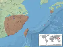 Cette espèce se rencontre dans l'est de la Chine, à Taïwan et dans l'archipel Nansei au Japon[1],[2].