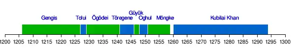 | Enfants | Djötchi[note 2] (1182–1227) Djaghataï (1184-1241) Khojen Beki (ru) Ögödei (1186—1241) Alaqai Beki, ° (1187/1190) Tolui (1190–1232) Tümelün, ° (1192) Alaltun (en), ° (1193) Checheyigen, ° (1194) |