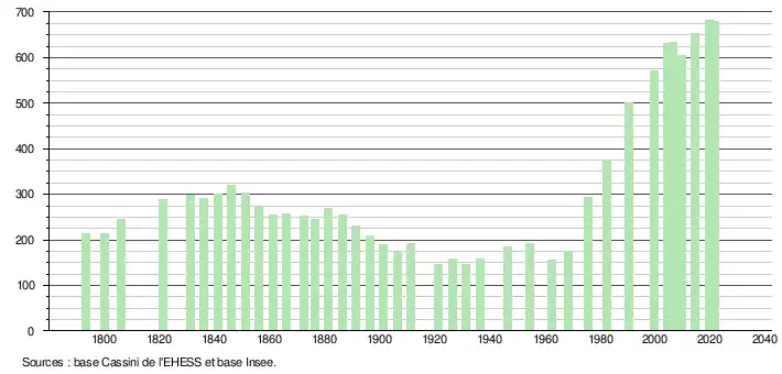 L'évolution du nombre d'habitants est connue à travers les recensements de la population effectués dans la commune depuis 1793. Pour les communes de moins de 10 000 habitants, une enquête de recensement portant sur toute la population est réalisée tous les cinq ans, les populations légales des années intermédiaires étant quant à elles estimées par interpolation ou extrapolation[20]. Pour la commune, le premier recensement exhaustif entrant dans le cadre du nouveau dispositif a été réalisé en 2004[21].
