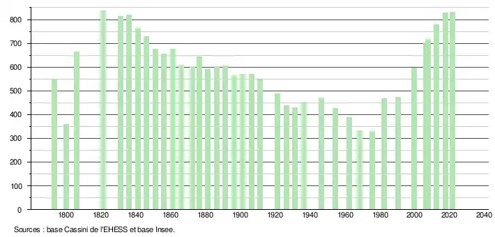 L'évolution du nombre d'habitants est connue à travers les recensements de la population effectués dans la commune depuis 1793. Pour les communes de moins de 10 000 habitants, une enquête de recensement portant sur toute la population est réalisée tous les cinq ans, les populations légales des années intermédiaires étant quant à elles estimées par interpolation ou extrapolation[24]. Pour la commune, le premier recensement exhaustif entrant dans le cadre du nouveau dispositif a été réalisé en 2007[25].