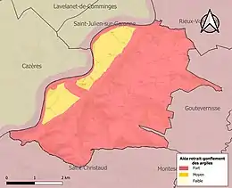 La commune est vulnérable au risque de mouvements de terrains constitué principalement du retrait-gonflement des sols argileux[35]. Cet aléa est susceptible d'engendrer des dommages importants aux bâtiments en cas d’alternance de périodes de sécheresse et de pluie. La totalité de la commune est en aléa moyen ou fort (88,8 % au niveau départemental et 48,5 % au niveau national). Sur les 195 bâtiments dénombrés sur la commune en 2019, 195 sont en aléa moyen ou fort, soit 100 %, à comparer aux 98 % au niveau départemental et 54 % au niveau national. Une cartographie de l'exposition du territoire national au retrait gonflement des sols argileux est disponible sur le site du BRGM[36],[Carte 3].
