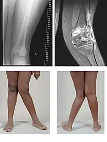 - « A clinical and biochemical study of chronic fluoride toxicity in children of Kheru Thanda of Gulbarga district, Karnataka, India » : « Radiographic changes suggestive of osteoporosis, osteosclerosis, and genu valgum was observed. Major skeletal manifestations observed in various studies of fluorosis are bowed legs(genu varum) or knock-knee (genu valgum), and stiffness of the cervical andlumbar spine.Our study also revealed skeletal fluorosis with cripplingbone deformities »
