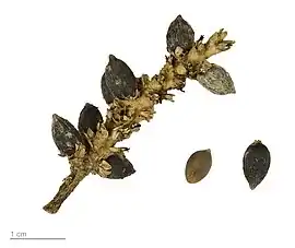 - Les fruits sont petits, allongés ou globuleux, verts devenant noirs ou bleus lorsqu'ils arrivent à maturité.