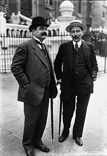 George Bonnamour (à gauche) et M. Quittard au procès d'Henriette Caillaux, en 1914. Photographie par l'agence de presse Meurisse.