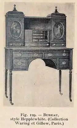 - Bayard Emile “Art de reconnaître les styles. Le style anglais” Ouvrage orné de 146 gravures 1922 Paris Librairie Garnier Pierre ed. 282p. (consultable sur Gallica ark:/12148/bpt6k6417100z ) ; la partie consacrée aux meubles est p. 217-275 ; Hepplewhite et son style p. 257 et s.