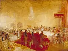 Les Tories, à la différence des Whigs tels que Lord Grey, mènent une guerre sans merci à Napoléon Ier[43]. L'alliance de la Prusse, de la Russie, de l'Autriche, du Royaume-Uni et de différents petits États contribue à l'abdication de Napoléon Ier le . Lors du Congrès de Vienne, il est décidé que l'électorat de Hanovre, en union personnelle avec le Royaume-Uni depuis , soit élevé au rang de royaume. Le , le prince-régent signe et ratifie le traité de Gand mettant fin à la guerre de 1812 contre les États-Unis. De retour de l'île d'Elbe, Napoléon Ier est vaincu à Waterloo le par Arthur Wellesley de Wellington, frère de Richard Wellesley.