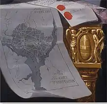 Le président Washington pose son coude sur les genoux d'une statue néo-classique de femme, représentant la Beauté au miroir ou Vénus. Derrière elle on aperçoit - un peu dans l'ombre - une autre figure féminine : c'est Minerve, la déesse de la Guerre. Les deux livres, en bas à droite, sont le Journals of Congress et Constitution and Laws of the United States. Avec cette peinture, Giuseppe Perovani a introduit aux États-Unis le goût du portrait académique, en style néo-classique.