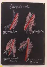 Après ses accumulations d'objets des années 1982-1984 — les Lunettes, les Vestes, les Bicyclettes —, les œuvres de Georges Autard persistent à présenter de nettes réminiscences de sa formation puisqu'elles suggèrent toujours des tableaux noirs chargés de signes et d'écritures, comme pour une histoire qui y semble codifiée. En 1990, en même temps qu'il aborde deux de ses thèmes importants, Per ornamento[4],[Note 1] et les Dessins napolitains[5], Georges Autard donne à ses tableaux plus de matière et plus de couleur. Intéressé alors par les travaux de Claude Viallat, simultanément fasciné par une Descente de croix de Fra Angelico, il s'affirme « expressionniste » et « narratif », mais aussi poursuivi par l'idée de chaos. Plusieurs récits désordonnés interfèrent en un seul tableau, comprend ainsi Annie Pagès[2]. Tel Dessin napolitain (pastel)[6] est de la sorte constitué d'« îlots de sens » : hétéroclite, pluriel, il met en situation des bribes de croix, des clous christiques ensanglantés, légendés du mot « relique », et l'écriture omniprésente du nom de Pythagore qui surgit là inopinément, à la façon d'une immixtion mathématique (ce qu'Autard appelle « le bon sens ») dans un univers mystique (ce qu'il conduit par jeu de mots à devenir « le Bon Sang »). « Raffolant à l'extrême des jeux de mots, des doubles sens et des analogies »[7], faisant de la sorte glisser les « sens », Autard jette des ponts qui font se rejoindre des champs différents, l'ordre logique et l'ordre sacré[2], « l'analytique et le métaphysique »[1], voire plus directement encore le Christ (les clous-reliques) et l'anti-Christ (Pythagore)[Note 2], offrant à Élisabeth Védrenne d'interpréter que « la perte de ce sang a entraîné la perte du sens, puis l'absence de centre, puis l'absence du linéaire, entraînant à son tour la multiplication des faisceaux, elle-même égale à la perte du sens unique, au règne de la simultanéité[7] ». Distribuant donc les « îlots de sens » que sont les motifs figuratifs (ici le clou et les bribes de croix) et les légendes (ici les mots « relique » et « Pythagore ») en une surface abstraite, privée de centre et cependant géométriquement organisée en stries et arabesques multicolores, l'œuvre suggère finalement à Jean-Pierre Delarge un fragment de papier peint des années 1930[8].