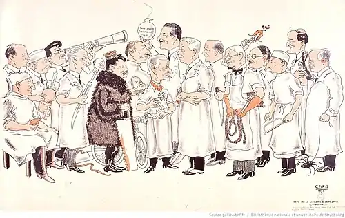« En 1918, la Faculté de médecine redevient française. Le doyen Georges Weiss, doté de pouvoirs exceptionnels a toute liberté pour le recrutement des professeurs; il sait tirer parti des côtés favorables de l’université allemande en les combinant avec les avantages de l'université française. Le corps professoral qu'il réunit en 1919 est composé de maîtres réputés. Certains avaient été recrutés sur place parmi des maîtres alsaciens, auxquels le titulariat était inaccessible avant 1914. Ne rappelons ici que quelques noms qui ont dépassé la renommée locale: Forster (anatomie), Léon Blum (interniste de physiopathologiste), Pfersdorff (psychiatrie), Schickelé (gynécologue et obstétricien). Un nombre égal de maîtres viennent d'institutions françaises fort différentes. Sans vouloir faire de palmarès, nous ne pouvons, faute de place, citer que quelques noms illustres: Borrel, dernier élève direct de Pasteur et inventeur de la théorie virale du cancer; Masson, histopathologiste mondialement réputé; Nicloux, illustre biochimiste; Ambard, physiopathologiste dont une constante porte le nom en éponyme; Leriche, protagoniste de la pathologie tissulaire et de la chirurgie fonctionnelle; Pautrier, dermatologiste, créateur d'un foyer florissant d'enseignement dermatologique; Bouin et Ancel, venant de la Faculté de médecine de Nancy, dont les laboratoires à Strasbourg allaient devenir des centres mondialement réputés de l'endocrinologie sexuelle expérimentale et aussi une pépinière de biologistes qui allaient illustrer la recherche et l'enseignement à Strasbourg et à Paris et dont nous ne rappelons que certains nom: Max Aron, Courrier, Benoit, Étienne Wolff. Combien d'autres que nous aurions voulu citer avec des sentiments de fidèle reconnaissance[22] ! »