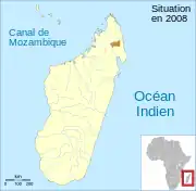 Cette espèce est endémique de Madagascar. Elle se rencontre entre 600 et 900 m d'altitude dans le nord-est de l'île. Sa présence est incertaine dans la presqu'île de Masoala[1],[2].