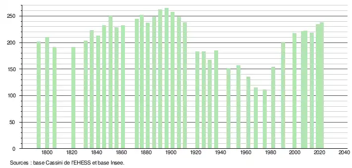 L'évolution du nombre d'habitants est connue à travers les recensements de la population effectués dans la commune depuis 1793. Pour les communes de moins de 10 000 habitants, une enquête de recensement portant sur toute la population est réalisée tous les cinq ans, les populations légales des années intermédiaires étant quant à elles estimées par interpolation ou extrapolation[16]. Pour la commune, le premier recensement exhaustif entrant dans le cadre du nouveau dispositif a été réalisé en 2008[17].