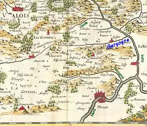 Au XVIIIe siècle, la Gergogne sert à alimenter les douves du Château de Gesvres-le-Duc[17]. Le château, propriété de la famille Potier, est construit au début du XVIIe siècle. Situé sur un terrain marécageux, il est assaini ; y sont creusés alors des canaux alimentés par la rivière d'Ourcq. Mais, en 1732, le duc d'Orléans intercepte les eaux de la rivière pour alimenter « le canal des Ducs » - ancêtre du canal de l'Ourcq. Ce canal doit conduire les bois de la forêt de Villers-Cotterêts à Paris ; les fossés du château ne sont plus alimentés. Le duc de Gesvres s'adresse alors à un ingénieur hydraulicien du roi qui fait ouvrir un lit pour recevoir les eaux de la Gergogne[Note 7] : « après un canal de bois, et de cascade en cascade l'eau allait tomber dans les avant-fossés... et dans une immense pièce d'eau qui alimentait le parc, renouvelant l'eau toutes les 24 heures »[18]. Le château initial est rasé à la Révolution, mais ses fossés et quelques bâtiments existent toujours.