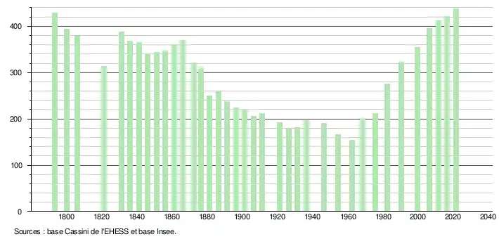 L'évolution du nombre d'habitants est connue à travers les recensements de la population effectués dans la commune depuis 1793. Pour les communes de moins de 10 000 habitants, une enquête de recensement portant sur toute la population est réalisée tous les cinq ans, les populations légales des années intermédiaires étant quant à elles estimées par interpolation ou extrapolation[13]. Pour la commune, le premier recensement exhaustif entrant dans le cadre du nouveau dispositif a été réalisé en 2006[14].