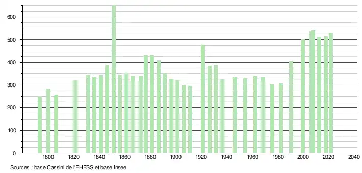 L'évolution du nombre d'habitants est connue à travers les recensements de la population effectués dans la commune depuis 1793. Pour les communes de moins de 10 000 habitants, une enquête de recensement portant sur toute la population est réalisée tous les cinq ans, les populations légales des années intermédiaires étant quant à elles estimées par interpolation ou extrapolation[66]. Pour la commune, le premier recensement exhaustif entrant dans le cadre du nouveau dispositif a été réalisé en 2007[67].
