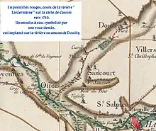 La commune de l'Aisne, Germaine n'est donc pas sur le cours d'eau en question mais est bien dans la même vallée sèche par perte d'eau -sauf en cas de crue - qui continue aussi jusqu'à Vaux-en-Vermandois et même, en passant par Étreillers, jusqu'au bois de Holnon près du lieu-dit Attily - bien visible sur la carte de Cassini[4],[5] -.