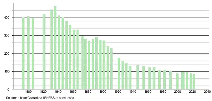 L'évolution du nombre d'habitants est connue à travers les recensements de la population effectués dans la commune depuis 1793. Pour les communes de moins de 10 000 habitants, une enquête de recensement portant sur toute la population est réalisée tous les cinq ans, les populations légales des années intermédiaires étant quant à elles estimées par interpolation ou extrapolation[14]. Pour la commune, le premier recensement exhaustif entrant dans le cadre du nouveau dispositif a été réalisé en 2007[15].